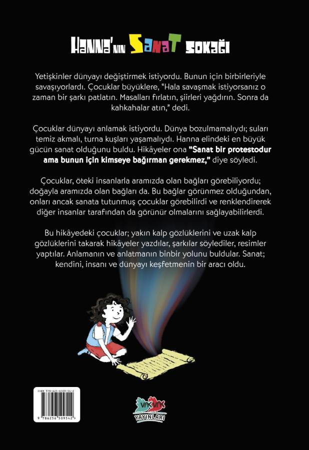 Hanna’nın Sanat Sokağı, sanatın sessiz ama güçlü diliyle barışı, empatiyi ve doğayla kurulan görünmez bağları anlatan felsefi bir çocuk hikâyesi… Hanna, şarkılar, resimler ve masallar aracılığıyla hem kendini hem dünyayı anlamaya çalışırken okura da farklı bakış açıları sunuyor.